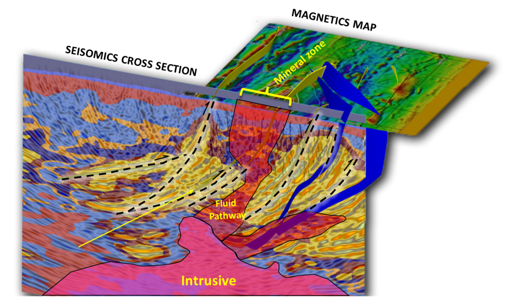 Seisomics is particularly effective in identifying regions of unique textural facies that are often associated with intrusions. These regions can then be brought in as structural constraints within inversion workflows for gravity, magnetics, and electromagnetic methods resulting in better resolved petrophysical properties including density, magnetic susceptibility, and electrical conductivity which can be used to target mineralization with enhanced probability.